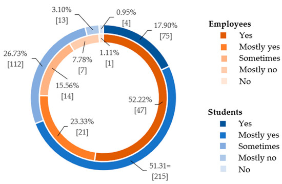 To visualize the ratio between the answers and the differences in the opinions of employees and students, a graphic representation of the data was created (Figure 2) (the number in square brackets represents the absolute frequency with which a particular answer was indicated by the respondents, and % represents the relative frequency of the total number of respondents). A total of 26.73% of students said that teachers only sometimes create an atmosphere of trust. The application of trust is therefore not a targeted decision for some teachers, and it is only a sporadic intuitive use of the aspect in question. However, to support creativity in the work environment, it is necessary that the building of trust and belonging among the members of the organization is thoroughly considered and planned.