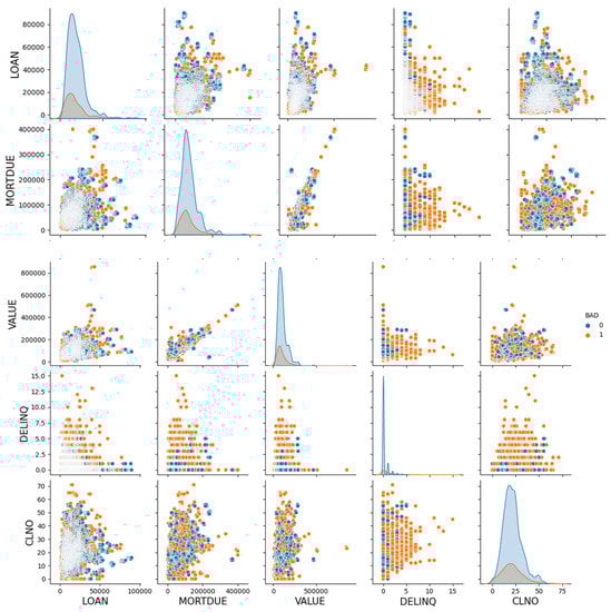 From the visual correlation graph in Figure 3, which helped identify the high correlation between the two variables VALUE and MORTDUE, the relationships between the other numerical variables were insignificant. More importantly, it was obvious to see the target variable, BAD, having a skewed (or unbalanced) class, whereby a high percentage (80%) contains 0 and a lower percentage (20%) contains 1. This is reasonable for the loan default scenario as the default rate is usually a much lower figure than the non-default rate. The unbalanced class can pose issues to model performance, which can be circumvented using a weighted approach such as in the case of the classic logistic regression implemented in this paper.
