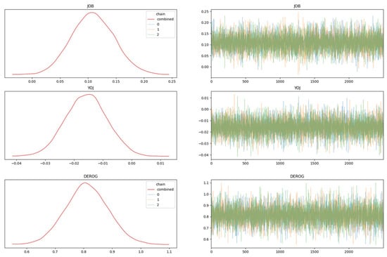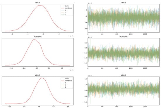 Figure 13, on the other hand, shows that the posterior did converge for high samples (further enhancement of the samples was not feasible due to limitations in computational resources). In this scenario, the comparison between 2500 samples versus 90,000 samples further shows that the differences between three models for the variable LOAN became the minimum.