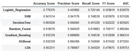 The overall performance for classic logistic regression and various machine learning models is summed up in Figure 9. Though various measurements were taken, the most reliable and suitable measure is the ROC-AUC metric listed at the rightmost. In ROC-AUC, the classic logistic regression achieved 0.8327, whilst the highest achievers were XGBoost (0.9733) and gradient boosting (0.9663), with random forest (0.9656) and SVM (0.9315) in the vicinity.