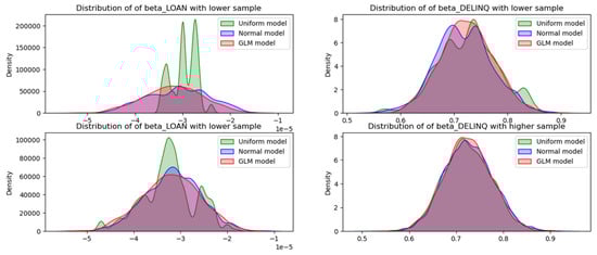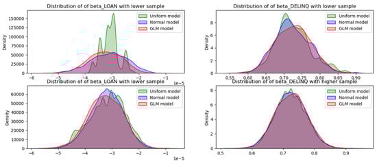 Figure 12 shows that with sufficient samples, all three Bayesian models converged sufficiently quickly to produce diminishing differences in the distributions for the variables, for example, LOAN and DELINQ showed bigger differences in lower samples (2500) than the higher one (9000). For the variable LOAN in the uniform prior model, the converge has happened, but not the ultimate.