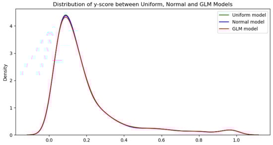 The differences in the mean of the predicted y-score drawn from the PyMC3′s posterior predictive sampling barely showed any difference in the distributions. In Figure 14, the first plot shows the difference between uniform and normal priors, the second shows the difference between uniform and GLM, and finally, the third plot shows normal and GLM priors. From the differences in the mean y-score, it can be concluded that the HMEQ dataset converged with all three non-informative priors.