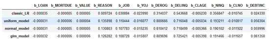 A side-by-side comparison of the coefficients in Figure 15 showed that the coefficients for the Bayesian models (uniform, normal, and GLM) were similar amongst the three. However, the coefficients for the variables REASON and DEROG for the classic logistic regression are far from the Bayesian ones.