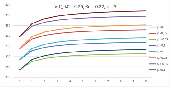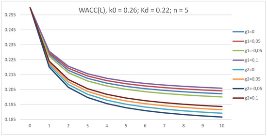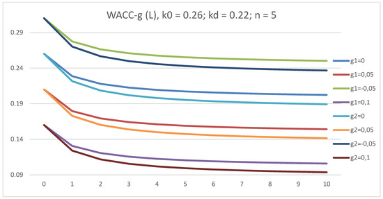 As can be seen from Figure 2, the curves (WACC–g)(L) decrease with leverage level, L, at all g values. The curves (WACC–g)(L) decrease with g. Thus, as it will be seen below, the company value, V, will increase with g.