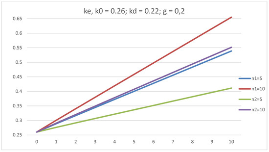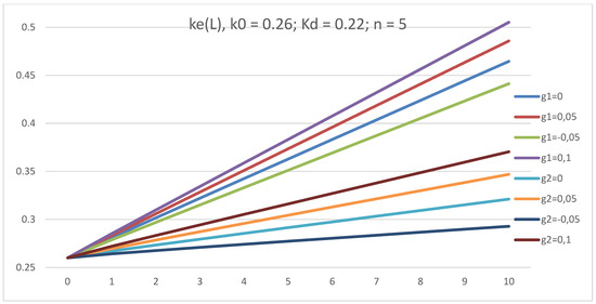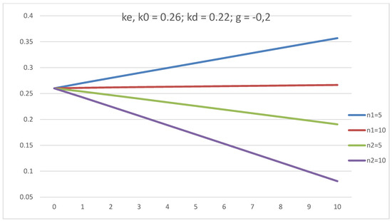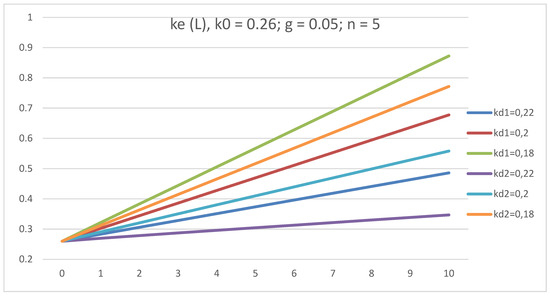 The dependence of ke on L for five- and ten-year companies is studied at g = 0.2 and g = −0.2. ke increases linearly with L, and the slope of ke(L) for a ten-year company is greater than that of a five-year company in the case of a positive g = 0.2. ke decreases linearly with increasing L, and the negative slope for a ten-year company is greater than that of a five-year company in the case of a negative g = −0.2 (see Figure 15 and Figure 16).
