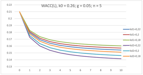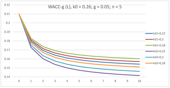- All curves, (WACC–g)(L), start from one point (0; 0.21) at all values of kd. At all values of kd, (WACC–g)(L) decrease with L. With the increase of debt cost, kd, (WACC–g)(L) decrease. Thus, the tax shield tends to lower the value of the discount rate (WACC–g) and, hence, increase the value of the company, V.