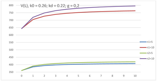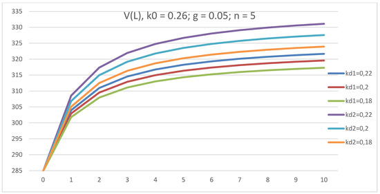 All curves of company value, V(L), at all values of kd for a five-year company start from one point (0; 285), as shown in Figure 7. V(L) increases with L at all values of kd and V(L) increases with kd. This means that tax shield advantages increase the company’s capitalization, V. All curves V(L) in the case of advance payments of income tax lie above the curves in the case of the payment of income tax at the end of periods. This means that advance income tax payments are beneficial for the company, as they increase its capitalization.