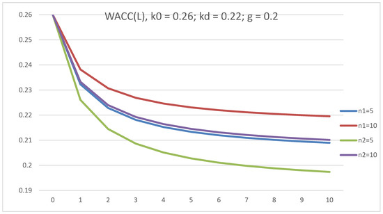 For both types of payments of tax on profit (at the end of periods (1) and advance payments (2)), as can be seen in Figure 1 for different values of g, all curves WACC(L) start from one point (L = 0; k0 = 0.26). These curves WACC(L) show the decrease of WACC with leverage level, L, at all g values. The curves WACC(L) increase with the growth rate, g. This is the first manifestation of the fact that under variable income, WACC is no longer a discount rate. As we will see below, the discount rate role has been taken over by WACC–g (here, g is the growth rate).