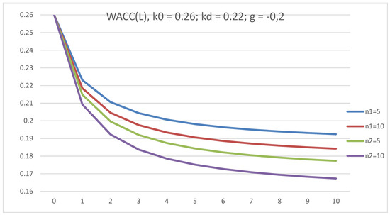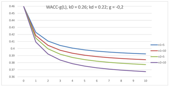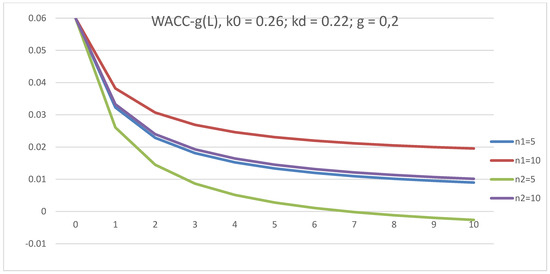 The dependence of WACC–g on L is investigated for five- and ten-year companies at g = 0.2 and g = −0.2. In both cases, all WACC(L) curves start from one point: (0; 0.06) for g = 0.2 and (0; 0.46) for g = −0.2 and decrease with L. The discount rate, WACC–g, is lower for the five-year company for positive g = 0.2, while WACC–g is lower for the ten-year company for negative g = −0.2. This effect been observed here for the first time (see Figure 11 and Figure 12).