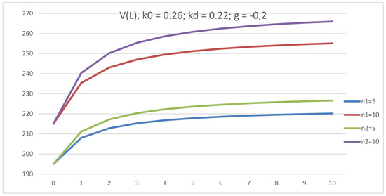 The dependence of V on L for five- and ten-year-old companies is studied at g = 0.2 and g = −0.2. The capitalization of the company, V, in both cases increases with leverage level, L, and an older age of the company corresponds with a larger capitalization, V. However, if the difference in the value of V for a five-year company and a ten-year company is about 400 at a positive growth rate (g = 0.2), this difference is 45 (ten times less) at a negative growth rate (g = −0.2) (see Figure 13 and Figure 14). Thus, in the competition between the company age and the growth rate, g, the growth rate, g, wins.