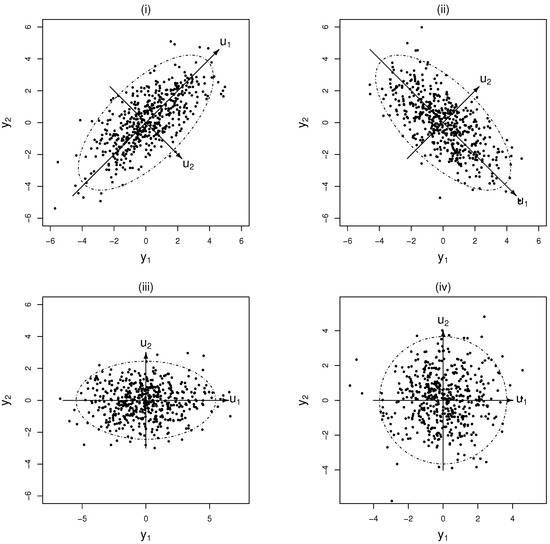 where is an orthonormal matrix of eigenvectors and is a diagonal matrix of eigenvalues of . As we know, the eigenvectors are also the principal components of the matrix . The eigenvalues are nonnegative since is positive semidefinite. For a simple illustration, let us consider Figure 1, the scatter plots of the normal random numbers with ellipses of 95% confidence interval, when the variance matrices are, respectively, , , and :