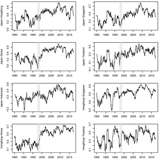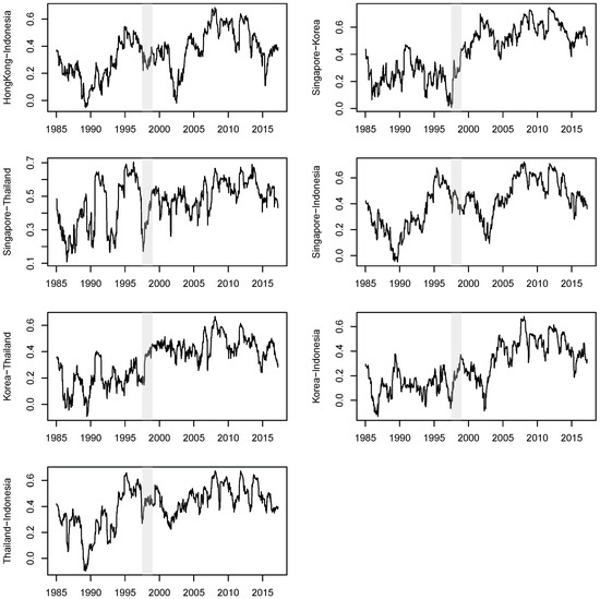 We used weekly (Wednesday close) stock return data, retrieved from Bloomberg, for six Asian markets: Japan (Nikkei225), Hong Kong (HangSeng), Singapore (STI), Korea (KOSPI), Thailand (SET), and Indonesia (JSX). The return series were calculated as 100.0 times log price differences in the local currency. The sample ran from 16 January 1985 to 29 March 2017, yielding 1531 observations. If any Wednesday observation was missing, Thursday’s index (Tuesday’s index if Thursday is still missing) was used. If the market was closed from Tuesday to Thursday, then the observation for that week was recorded as missing.