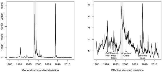 In Figure 3, the plot of (the standard deviation version of ) distinctly shows the events of extreme volatility, such as the Asian crisis in 1997 and the recent subprime crisis in US (2008–2010). The medium-scale volatile events are overshadowed by the extremely high volatility peak of both crises. By contrast, the geometric average version has a much smaller range (from 2.0 to 6.0), and reveals other episodes of turbulence more clearly. For example, even the damaging impacts from the Mexican Peso crisis in 1994 and the Argentine financial crisis beginning in 2000 can be detected from the two smaller sharp kinks in , while these were somewhat obscured in the graph of .