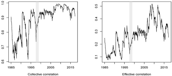 A significant increase of the overall correlation in the recent decade was confirmed by both the collective correlation (CCOR), , and effective correlation (ECOR). The effective correlation demonstrated a more noticeable increase from 0.12 to 0.38 after the crisis.