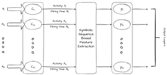 The architecture of ChaosNet () Luröth neural networks for purposes relating to classification. C1, C2, …, Cn are the unit dimensional GLS neurons. Each neuron initially exhibits q units of normalized neuronal activity. The input to the network, or the normalized collection of stimuli, is denoted by the . When a GLS neuron Ci’s chaotic activity value A(t), starting from initial neural activity (q), reaches the ε -a neighborhood of stimulus, it stops firing chaotically. This neuron has a “firing time” of Ni ms. A(t) contains topological transitivity symbolic sequence feature pi. This feature is extracted from the A(t) of the Ci’s GLS-neuron.
