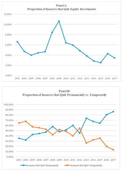 Table 7 and Figure 1 report time-series changes in the numbers of insurers who quit equity investments from 2003 to 2017. Noticeably, more insurers decided to terminate their positions in the equity market from 2007 to 2009, when the market was experiencing a severe financial crisis (Figure 1, Panel A). In 2009, the proportion of insurers that quit equity investments relative to all insurers who held equity investments in unaffiliated firms increased to 11% (from 5% prior to the crisis). Before the financial crisis, the majority of insurers that left the equity market did so on a temporary basis. However, during and after the crisis, we observe a drastic reversal in that trend, as the majority of these firms that quit equity investments did so on a permanent basis (Figure 1, Panel B). These observations suggest that insurers stop investing in equity when they experience large losses from equity investments. Moreover, it is worth noting that in years with low market interest rates, relatively small numbers of insurers leave the equity market.