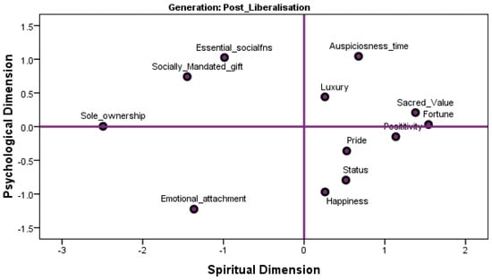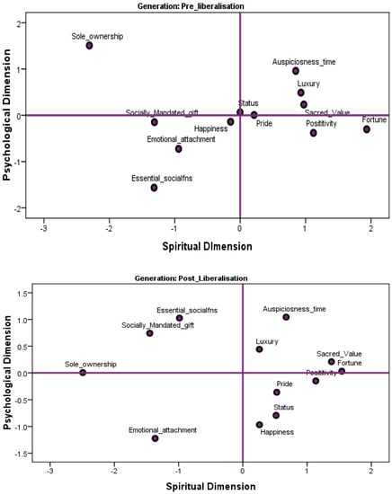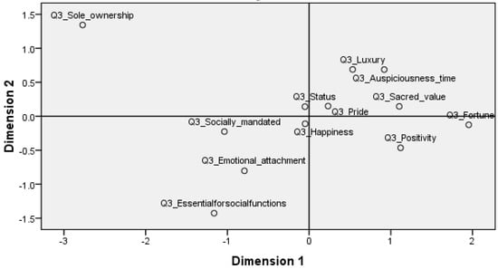 The dimensions were identified based on the attributes on extreme ends or loading towards a dimension. On the positive end of Dimension 1 attributes lies fortune, sacred value, and positivity loadings of 1.9353, 0.9734, and 1.121, respectively. In contrast, on the opposing end, sole ownership (−2.3056), socially mandated gift (−1.3107), and essential for social functions (−1.3164) are the attributes. These are primarily related to the mystical properties of gold (Behr 2010), “The Symbolic Nature of Gold in Magical and Religious Contexts”, beyond the material benefits, and hence the dimension has been profiled as spiritual benefits.