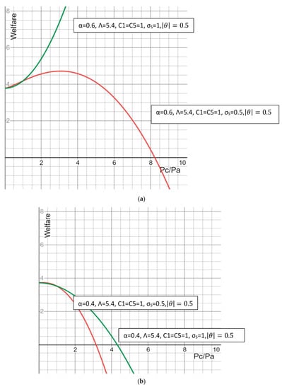 Combining all these conditions, we can argue that, given endowment shares such that and cost-shares such that , price changes like —triggered by excessive CF shifting Sw leftward and Dw remaining the same or shifting right (due to increase in GDP)—will induce an endogenous limit on CF via elasticity of substitution in production (between L and V)—see Figure 5a,b. Thus, it will ensure that .