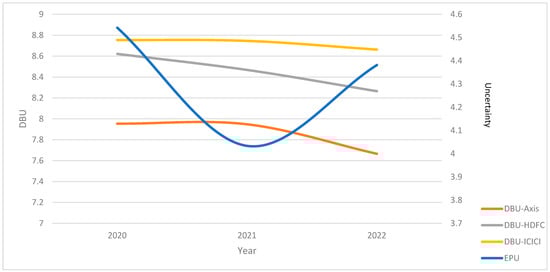 In India, HDFC Bank’s digital banking efforts have improved consumer interactions with the bank overall by enhancing accessibility, convenience, and security. In a fast shifting digital market, the bank has used technology to provide creative solutions that address the changing demands of consumers (Borthakur 2022). However, during the COVID-19 pandemic period, there was a negative relationship between the usage of digital banking and economic policy uncertainty (see Figure 1).