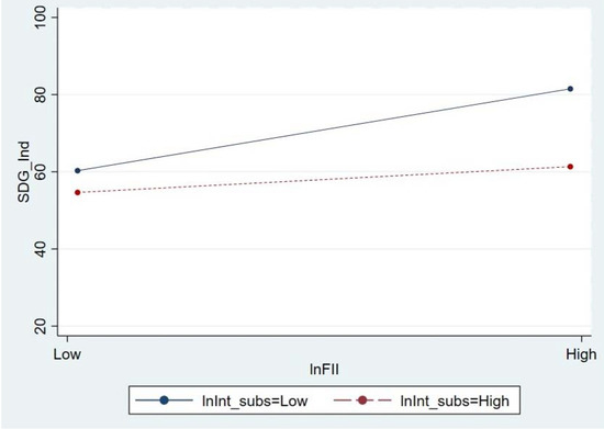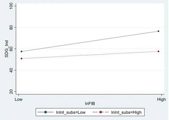 It is evident from the above calculations that with one unit change in FI (‘lnFIB’ and ‘lnFII’), there is a 1.532 and 2.276 unit change in SDG, respectively, at lnInt_subs in Equations (5) and (6). It is observed that the marginal effect of FI on SDG is no longer equal to the estimated β1 (in Equations (5) and (6)). This is why the FI influences the SDG through interaction terms involving the moderator lnInt_subs (Internet subscribers). It can also be observed that the marginal effect of change in FI is still independent of the value of the FI proxies. It depends on the value of lnInt_subs. Hence, it validates the interaction effect observed through Models 3 and 4 (Onukwugha et al. 2015; Busenbark et al. 2022). It should also be observed that as the value of ‘lnInt_subs’ increases, the FI’s effects on SDG is reduced.