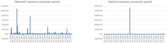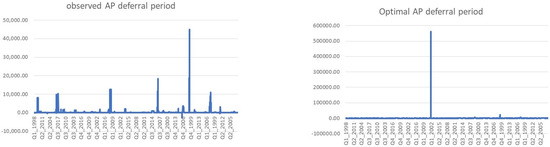 The results in Table 2 show significant variations between the breakpoints in the cases of observed values of the accounts payables deferral period and observed inventory conversion period. In this case, the structural breakpoints in these two components indicate significant instability in the management of these two components. Nevertheless, when these two components are managed optimally in a way that targets lagged industry average ROA, the majority of the observations (up to 35% of the quarterly data) can be stabilized in the sense that the variations between the breakpoints in the cases of optimal values of the accounts payables deferral period and optimal inventory conversion period are insignificant. This is also evident in Figure 1 and Figure 3, in which these two optimal components of working capital are much more stable than those observed.