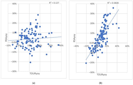 Figure 1a,b shows the scatterplots of the year-on-year changes of retail sales amounts and number of tourists in the periods 1999–2008 and 2009–2019. The former shows a weak association between the two, as shopping tourism was not popular, whereas the latter shows a much stronger positive association between the two; during this period, same-day visitors, who are mostly shopping tourists, accounted for more than half of the total number of tourists.