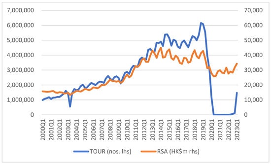 Number of tourist arrivals () and retail sales amount () in Hong Kong, Q1 2000–Q1 2023. Sources: HK C&SD (2023b) and HK RVD (2023a).