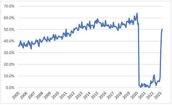 The COVID-19 pandemic had a profound impact on shopping tourism in Hong Kong, causing significant disruptions to international and cross-border travel. Travel restrictions, quarantine measures, and diminished consumer confidence resulted in a sharp decrease in the number of shopping tourists visiting the city. The absence of mainland Chinese shopping tourists, who constituted a substantial portion of Hong Kong’s shopping tourists, particularly affected the retail sector. This decline is evident in the drastic reduction in the ratio of same-day visitors to the overall number of visitors during the pandemic, dropping from a peak of 64% in January 2020 to a mere 0.3% in August 2021 (Figure 3). Hong Kong’s tourism sector has experienced a rapid recovery since the reopening of borders in March 2023. The number of tourists has surged from 3830 in Q1 2022 to 1,471,584 in Q1 2023. Shopping tourism has also started to regain momentum, with the ratio of same-day tourists to the total number of tourists climbing back up to 47% in Q1 2023.