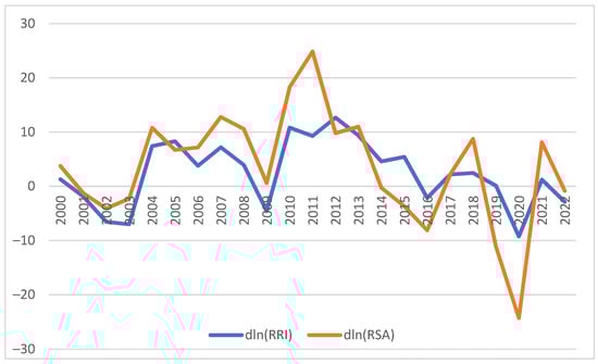 Furthermore, all the series are tested for their stationarity by two unit root tests. Table 2 shows the results of the stationarity tests by applying the Augmented Dickey–Fuller (ADF) and the Philips–Perron (PP) tests. Almost all variables in both yearly and quarterly time series are non-stationary in their level terms and stationary in their first differences in either test, except the yearly inflation variable , which is marginally stationary in its first difference, with t-statistics = −2.33 (p-value = 0.17) and −2.36 (p-value = 0.16) in the ADF and PP tests.
