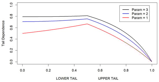 Copulas are divided into copula families and are classified according to their distributional properties. Elliptical and Archimedean copulas can be classified as implicit copulas, such as Gaussian and Student’s t copulas. Explicit copula examples are Clayton, Frank, and Gumbel types; see (). An Archimedean copula is a copula of the form: