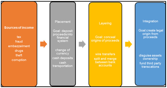 Economic players are rewarded for using factors of production (Littrell 2022; Mohr and Fourie 2008; Masciandaro 1999). Rewards can be earned legally or illegally but still need to be accounted for under the economic performance statistics. However, illegally earned funds remain difficult to account for due to the falsification of income sources (Clarke 2021; Sotande 2018; Arnone and Borlini 2010). The sources of dirty money include (among others) corruption, fraud, tax evasion, theft and bribery. Historically, money laundering has gone through three stages. These are placement, layering and integration. However, with digital innovations, money laundering can occur at any of these three stages. Each stage has associated activities, which are shown in Figure 1. Typical money laundering activities at each stage are illustrated in the schematic map below.