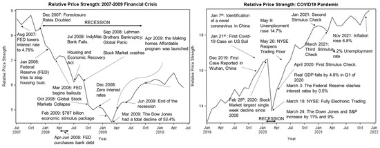 The effect of the 2008 financial crisis (left chart) and the COVID-19 pandemic (right chart) on the RS performance of stock and commodity markets is shown in Figure 1, using monthly values of the PPI and S&P 500 from July/2007–June/2010, and January/2019–December/2021. The financial crisis of 2008 started when foreclosure rates doubled in December 2007. While a number of macro-measures were adopted to stop the roller coaster that was about to unfold, one of the first decisions was U.S. President Bush’s signing of the Tax Rebate Act in February 2008. As the crisis unfolded with bank failures, bailouts by the Federal Reserve started in March 2008, and, of course, the bankruptcy of the Lehman Brothers created global panic, leading to the lowest point in the RS, the time at which the U.S. Dow Jones Industrial Average had a total decline of 53.4% (Figure 1, left chart). Naturally, all of these events altered the RS’s short-term trajectory, marking the end of the bull market in commodities and marking the start of a new period of growth in stock markets. The recovery phase from the financial crisis was much slower and less steep than what occurred during the COVID-19 Pandemic (Figure 1, right chart). In fact, both crises may be characterized by a “V” shape pattern, the major difference being the speed of recovery (i.e., recovery was faster during the Pandemic).