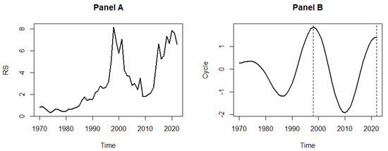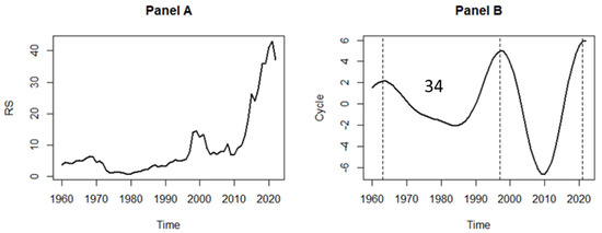 Figure 2, Figure 3 and Figure 4 show the results of the Christiano-Fitzgerald bandpass filter applied to the relative price strength (RS) of (a) stocks and the producer price index for all commodities (Figure 2), (b) stocks and the Bloomberg Commodity Index (Figure 3), and (c) and stocks and Goldman Sachs Commodity Index (Figure 4). Figure 2 shows the RS cycle over the period 1871–2022. Note that variability in the RS cycle began to increase approximately in the 1930s and continues to the present. The overall upward tendency of the RS cycle observed in Figure 2, Panel A confirms that on average, stock returns outperformed commodities over the last 151 years. However, the Christiano-Fitzgerald econometric cycle (Figure 2, Panel B) demonstrates the cyclical behavior of the relative pricing performance of stock-commodity markets. Based on Figure 2, Panel B, three cycles (from peak to peak) can be fully identified. The first cycle lasted 24 years, and the subsequent cycles had a length of 35 and 34 years, respectively. The average length of the three stock commodity cycles shown in Figure 2 is 31 years. Also, it should be noted that there is a fourth cycle in progress that began 23 years ago, whose peak is yet to occur but is quickly approaching it.