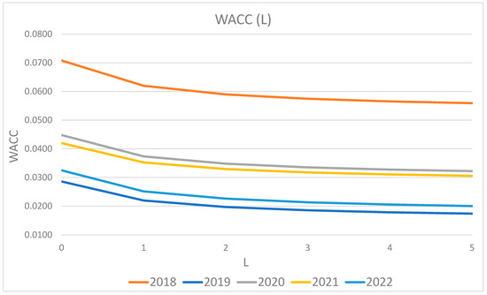 In the case of the tax shield approach, a tax interest rate (t) equal to 20% was also used to find the WACC values for each year (Formula (2)):
