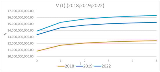 Figure 1 shows that WACC decreases with leverage level, L, at all years. This leads to an increase in the value of the company V(L) with leverage level, L (see Figure 2). Points from which WACC starts to decrease with leverage level, L, depend on the values of .