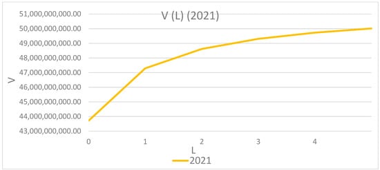We show the dependence of PJSC Gazprom value, V(L), on leverage level, L, for 2021 separately in Figure 3, since the V(L) value for 2021 is significantly higher (more than three times) than for other years.