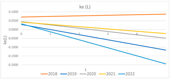 Figure 4 shows that the cost of equity, ke, decreases linearly with leverage level, L, in all years except 2018. The negative slope ke(L) is explained by the fact that the cost of debt kd is greater than k0.