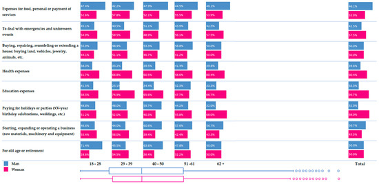 Of those who chose option (1), food, personal, or utility expenses (survival expenses), 45.7% were men and 54.3% were women. Based on the descriptive statistics in Table 2, women spend their savings on household needs, mainly food or utilities, in a slightly higher proportion than men. It is also noteworthy that for men and women, this was the priority destination of saving, although no significant differences were observed according to gender.