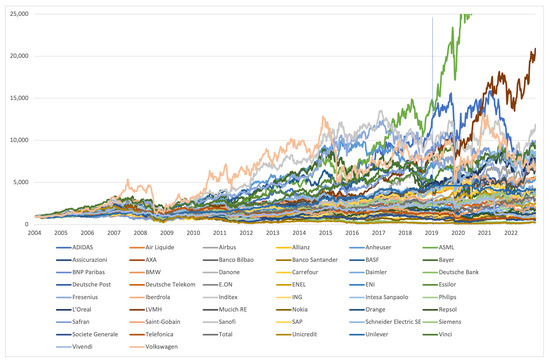 This study focuses on 50 major European companies and on the period ranging from 1 April 2004 to 31 March 2023. Within this 19-year period, we start by excluding from the analysis the last 4 years (later used on to perform out-of-sample analysis), mainly focusing on the first 15 years.