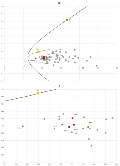 Mean-variance representation. (a) Full picture. (b) Zoomed picture. Mean-variance representation of the investment opportunity set frontier assuming short selling is allowed (the hyperbola from Equation (6), blue line) or not allowed (set of constrained hyperbolas); individual assets (grey dots); the various portfolios—tangent portfolio (T, orange square), tangent portfolio with no short selling (TNS, yellow square), homogeneous portfolio (H, blue triangle), absolute and relative active portfolios (AAP and RAP; light and dark green squares, respectively), average portfolios (MAAP and MRAP; light and dark red squares, respectively), and the TR index (purple). For the active portfolios (AAP and RAP), the representation is based upon initial compositions.