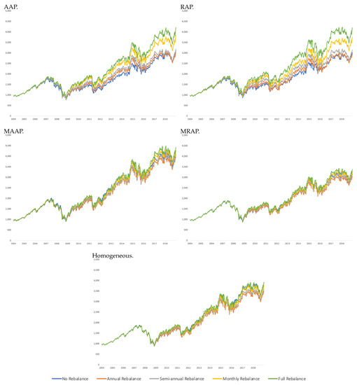Table 3 shows the actual weights determined for all portfolios. It is important to recall that the homogeneous (H), tangent (T and TNS), and mean (MAAP and MRAP) portfolios are passive, so the reported weights are those used to rebalance the portfolio on the appropriate dates for each rebalancing scheme. That is not the case for the active recommendation-based portfolios (AAP and RAP), which have different weights for all possible rebalancing dates and schemes. Having to opt for a concrete composition to use in Figure 3 and Table 3, we considered the initial compositions, which are the actual compositions over time, only for the no-rebalancing scheme. We note that the TNS portfolio requires investment in only 8 assets, which (not surprisingly) are the best-performing assets (based on the comparison of Sharpe ratios of individual assets shown in Table 2).