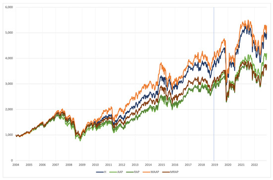 As part of our robustness check, we also consider the alternative maturities: , , , and . For each of these maturities, we consider all possible investment start dates within the 15 years and look at the average performance of portfolios for each strategy and the EUROSTOXX TR index. This comprehensive approach allows us to thoroughly assess the effectiveness of our strategies across different investment horizons and identify any potential variations in performance based on varying time frames. Finally, we perform and out-of-sample analysis using the last 4 years of data (previously excluded from the analysis: from 1 April 2019 until 31 March 2023).