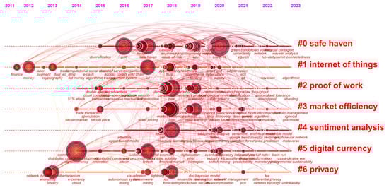 In Figure 3, the timeline map presents a visual representation of the clusters’ temporal trajectories, and it is clear that the largest cluster, labeled as Cluster #0, relates to ‘safe haven’. This result indicates that the overlap between bitcoin and the safe haven concept has emerged as a significant focus within the bitcoin literature (Barbu et al. 2022; Barson et al. 2022). The idea of a safe haven, including factors such as gold, hedging, volatility spillover, and diversification, has become intricately intertwined with the broader bitcoin discourse as the need for financial security and hedging against traditional markets underlines the value of innovative financial instruments like bitcoin (Ammous 2015). Cluster #1, termed ‘internet of things (IoT)’, encapsulates a fascinating range of concepts, mainly highlighting the core facets of bitcoin—the intersection of finance, cryptography, and technology (Bhushan et al. 2021). The involvement with emerging technologies, whether through AI, cybersecurity, or payment systems, is a crucial factor in this context. Moreover, this cluster provides a unique aspect of the bitcoin conversation and offers insights into the complex dynamics and challenges intrinsic to bitcoin. The focus on trust reflects a fundamental issue in the bitcoin domain, which aims to establish and maintain trust in a decentralized, cryptographic system (Ali et al. 2023; Arli et al. 2021). The research represented by this cluster explores various facets of trust, with a specific emphasis on trust in the context of cryptocurrency markets, herding behavior, and the overall financial landscape (Ajaz and Kumar 2018; Almeida and Gonçalves 2022).