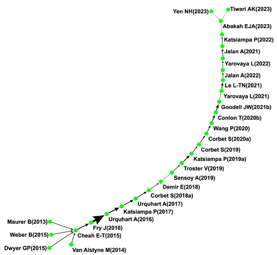 The citation network analysis uncovers two local paths marked by influential connections, while the principal global path showcases the most impactful route within the sphere of bitcoin research. This path contains 28 crucial papers. The strongest connection is observed between Fry and Cheah (2016) and Urquhart (2016), followed by the link between Urquhart (2016) and Katsiampa (2017), and subsequently, the connection between Conlon et al. (2020) and Goodell and Goutte (2021) (see Figure 7). These works mainly delve into the analysis of bitcoin’s price behavior, volatility, and its role as a potential safe haven asset, particularly in response to significant economic events such as the COVID-19 pandemic. These research papers examine various aspects, including the occurrence of financial bubbles and crash in cryptocurrency markets, the clustering of bitcoin prices, the estimation of bitcoin’s price volatility, and the impact of global events on its price movement. Interestingly, the thickness of citation links is significantly pronounced at the commencement of the global main path. This indicates that earlier published studies have attracted more recognition and consideration within the field of bitcoin research. The location of these papers towards the beginning of the path incites contemplations about whether this accurately represents their relevance in the bitcoin domain, or if it is primarily motivated by the heightened initial interest in this burgeoning field. Consequently, with the introduction of new research in the bitcoin field, the importance of these earlier studies demands reassessment.