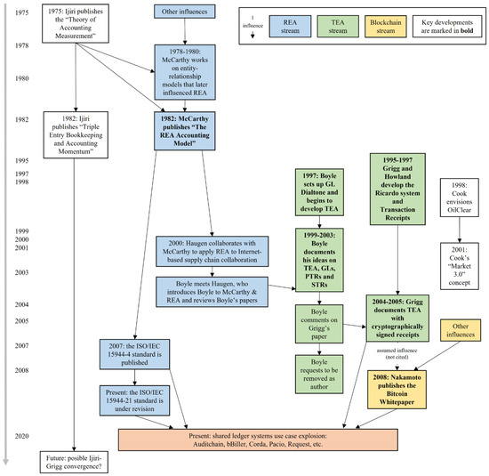 Essential history of TEA, showing the parallel development and confluence of three streams of research on shared ledger systems, namely REA, TEA and blockchain.