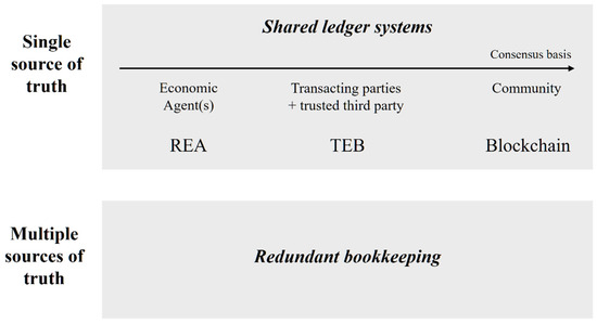 With traditional redundant bookkeeping, multiple sources that describe the same economic event exist and various versions can arise. This differs from shared ledger systems such as REA, triple-entry bookkeeping and blockchain, which incorporate designs for a single source of truth. The consensus basis on which the truth is determined depends on the specific shared ledger system.