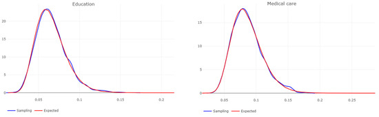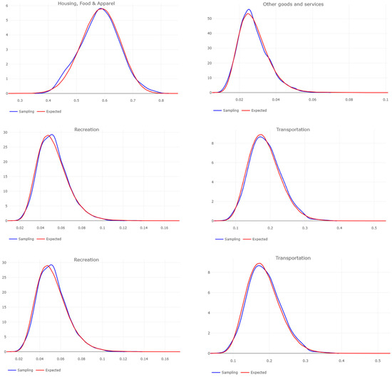 We next provide the results from our performed simulations as well as the corresponding sampling distributions for each aggregated CPI component, compared to the expected CPI weight distribution.