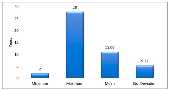 The industry experience of the respondents ranged from a minimum of 2 years to a maximum of 28 years. The mean value was calculated at 11.09 years, with a standard deviation of 5.320 years, as indicated in Figure 2 below.