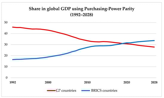 Further, Figure 1 depicts the share of global GDP using purchase-power parity from 1992 to 2028. The data show a continuous decline in the share of G7 nations, consisting of Canada, France, Germany, Italy, Japan, the United Kingdom, and the United States. The BRICS nations have shown a consistent rise in their share of the global GDP since 1992 and have outpaced the G7 nations since 2020.
