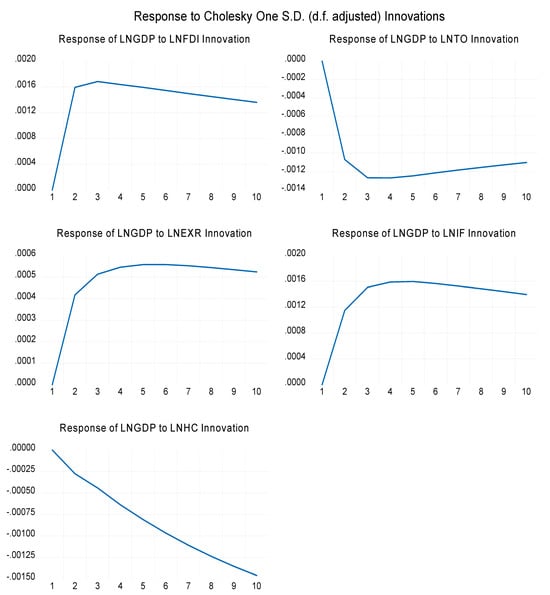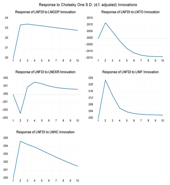In the second year, the forecast error variance explained by FDI, GDP, and IF is 98.77%, 0.74%, and 0.45%, respectively, as shown in Table A3 in Appendix A. In the short run, FDI is explained by its own lagged values. The role of other variables in the short run is limited. Likewise, 93% of FDI alone explains itself in the long run, suggesting that FDI plays a substantial role, followed by GDP, in influencing fluctuations more than the other variables. Further, the variance decomposition results of GDP, as shown in Table A4 in Appendix A, indicate that in the first year, 98% of the variances in the forecast error are explained by GDP itself and only 1.76% by FDI. The remaining variables have no explaining power in both short-term and long-term periods.